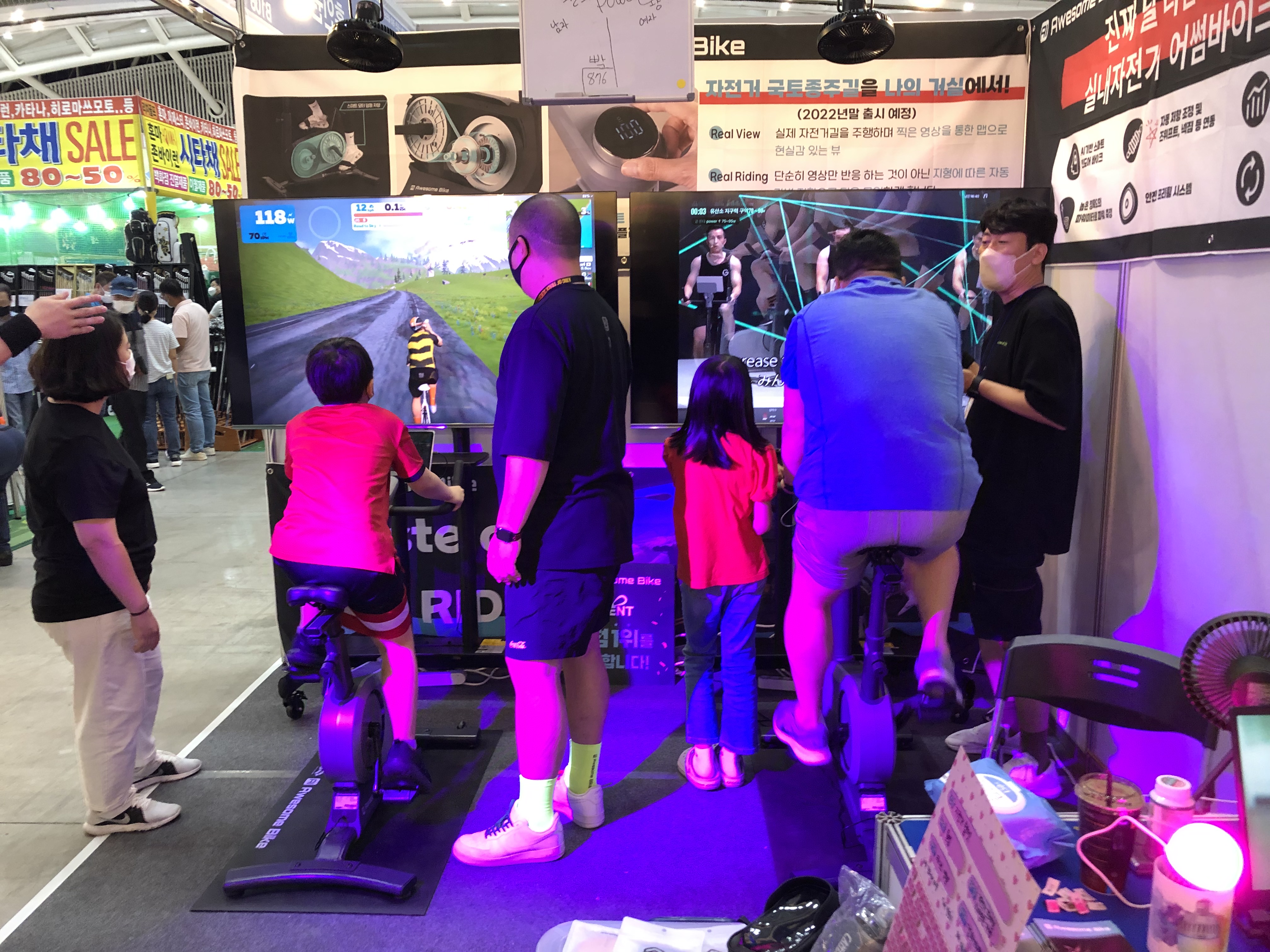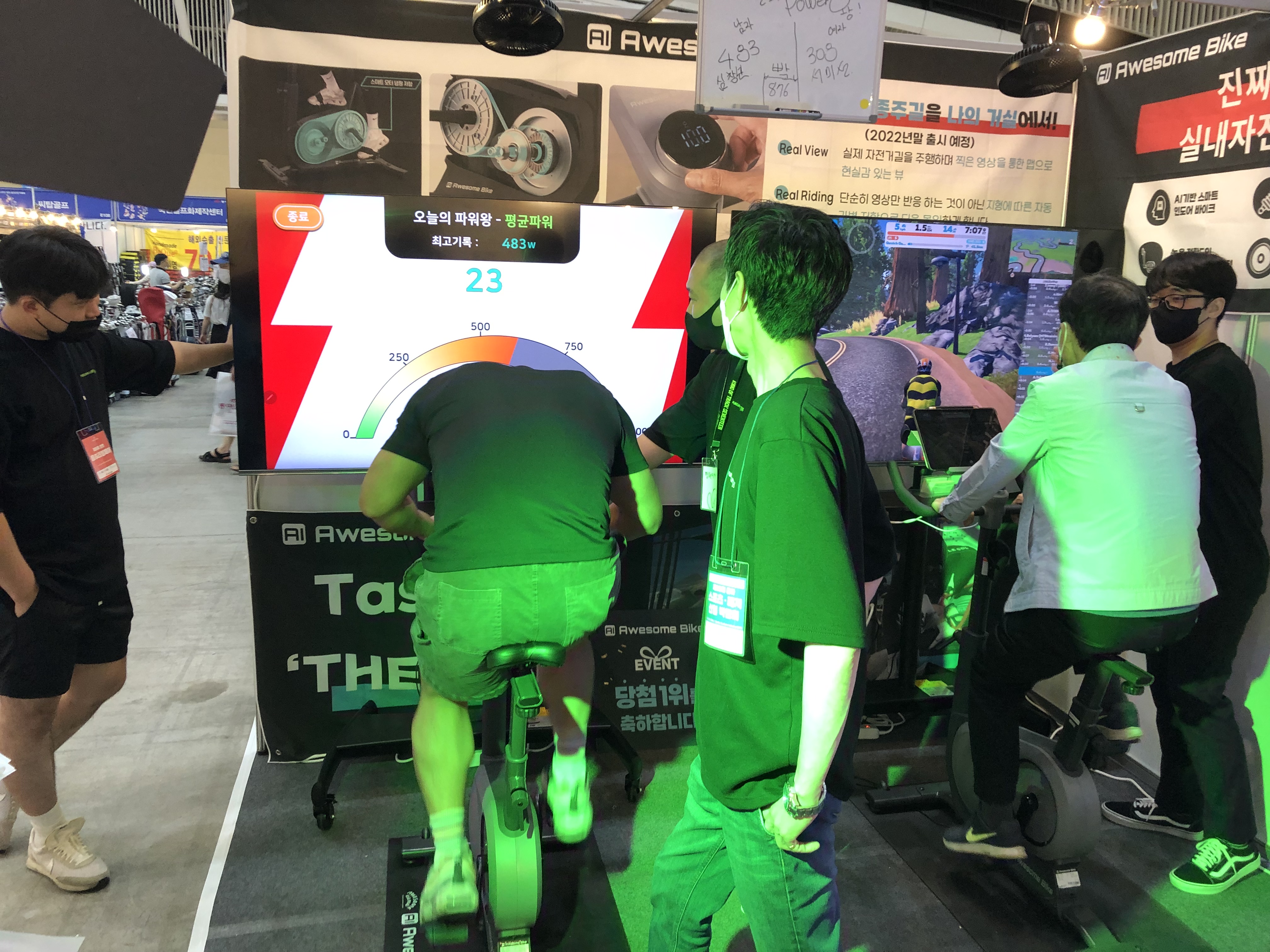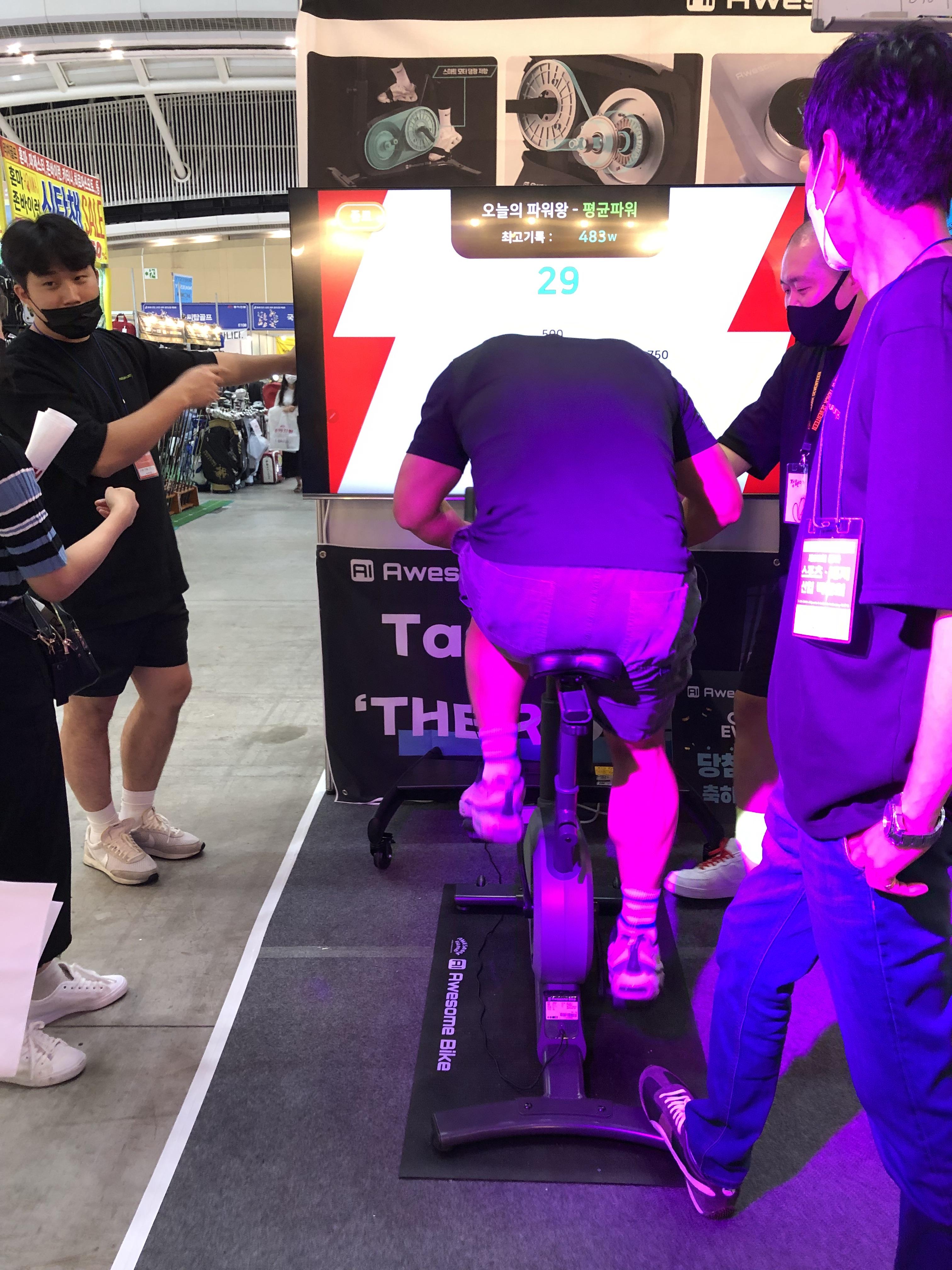 따라서, 다양한 컨텐츠로 일정을 꽉 채우고 한 번이라도 눈길을 받기 위해 어썸바이크를 체험하시는 분들에게는 아낌없이 사은품을 증정했습니다. 파워챌린지 뿐만 아니라, 어썸바이크의 네이티브앱, 즈위프트, 및 연내 출시 준비 중인 국토종주자전거길을 선보였고 체험자분들도 긍정적인 피드백을 주시고 현장에서 구매해 가시는 분들도 여럿 계셨습니다.